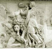 [[Datei:KetoAltar.jpg|180px|thumb|right| Keto hilft ihrem Vater Pontus in der Gigantomachie — c. 166–156 BC — Gigantomachy Frieze, Pergamon Altar des [[Olympische Götter#Zeus|Zeus]] ]] | |||