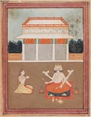 Brahma war er sofort betört und verfolgte sie, wohin sie auch ging. Shatarupā bewegte sich in verschiedene Richtungen, um seinem Blick zu entgehen, aber Brahmā entwickelte einen anderen Kopf, bis er vier hatte, einen für jede Richtung des Kompasses. Verzweifelt sprang Shatarupa über ihn, um sich für einen Moment seinem Blick zu entziehen. Da erschien ein fünfter Kopf über den anderen, und so entwickelte Brahmā fünf Köpfe...
