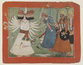 In der Rechten hält er einen ankusha (Elefantenstachel), eine Parashu (Axt), ein Schwert, einen Speer, eine Schlange, eine Pascha (Schlinge) und ein Pustaka (Buch).