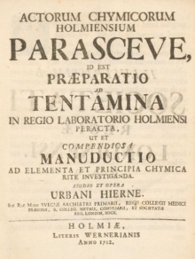 - Acta et tentamina chymica in regio laboratorio Stockholmiensi, elaborata et demonstrata, in decades redacta atque divisa, una cum praemissa parasceve seu praevia manuductione ad experimenta rite perficienda, Autor Urban Hiärne, Verlag Excudebat Joh. H. Wernerus, 1712, ASIN: B0014SJX0U