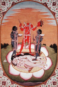 Sie steht auf Kama, dem Liebesgott, der auf einem Lotus liegend seine Gemahlin Rati umarmt. Ein Konsorte ist Shiva als Kabandha.