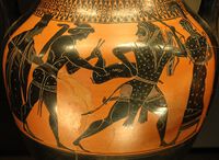 Die dritte der Aufgaben des Herakles bestand darin, die Kerynitische Hirschkuh zu fangen, die eingoldenes Geweih hatte. Als Artemis war eine der fünf während ihrer Jagdprobe gewesen, die Zeus ausgewählt hatte. Nachdem Herakles die Kuh schließlich gefangen hatte, zog er sich Artemis Zorn zu, da ihr die Hirschkuh geweiht gewesen war.