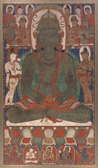 Amitābha wird auch oft mit den zwei Bodhisattva - Begleitern Avalokiteshvara(Padmapani) (rechts) und links Mahāsthāmaprāpta(bzw. Vajrapani) dargestellt.