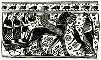 Apollon als Wagenlenker mit zwei Musen trifft Artemis - 800 v.Chr.