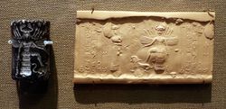 Isthar steht auf einem Löwen mit Bogen; rechts oben Siegel des Schamasch