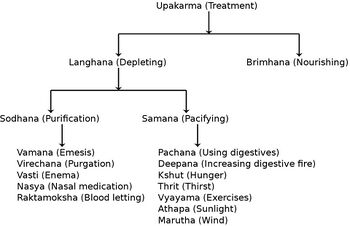 • Ein weiteres wichtiges Konzept ist das Konzept des ama('unverdaut')[9], das das Ergebnis schlecht verdauter Nahrung ist, die sich im Körper in Gift verwandelt. Daher hat das Ayurveda sog. Panchakarma zur Entgiftung