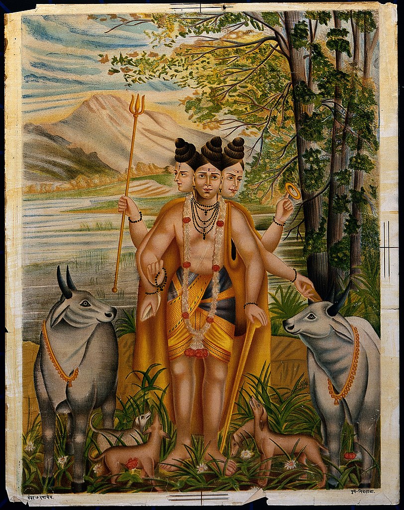 https://commons.wikimedia.org/wiki/File:Dattatreya_accompanied_by_his_four_dogs_amongst_cows._Chromo_Wellcome_V0045071.jpg