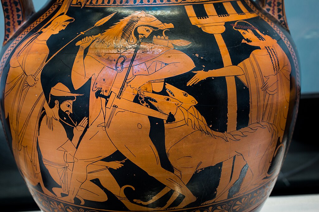 | aktuell | 16:21, 24. Okt. 2023 | 1.024 × 683 (201 KB) | Adm1 (Diskussion | Beiträge) | https://commons.wikimedia.org/wiki/File:Painter_of_Munich_2306_ARV_225_1_Herakles_and_Kerberos_-_Apollon_and_Leto_in_quadriga_(05).jpg?uselang=de English: object type / vase shape: attic red figure amphora tympe A Side A: Athena standing, Hermes kneeling, Herakles drags Kerberos out of Hades (propylon), Persephone (?) - side B: Apollon and Leto standing in the chariot of a quadriga, Artemis, goddess - production place: Athens - painter: Painter of Munich 2306 - period / date: late archaic, c… |