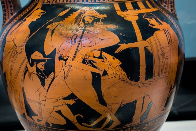 Side A: Athena standing, Hermes kneeling, Herakles drags Kerberos out of Hades (propylon), Persephone (?) - side B: Apollon and Leto standing in the chariot of a quadriga, Artemis, goddess - production place: Athens - painter: Painter of Munich 2306 - period / date: late archaic, ca. 500 BC - material: pottery (clay) - height: 60 cm - findspot: Vulci - museum / inventory number: München, Staatliche Antikensammlungen 2306 - bibliography: John D. Beazley, Attic Red-Figure Vase-Painters, Oxford 1963(2), 225, 1 - Please note: The above museum permits photography of its exhibits for private, educational, scientific, non-commercial purposes. If you intend to use the photo for any commercial aime, please contact the museum and ask for permission.
