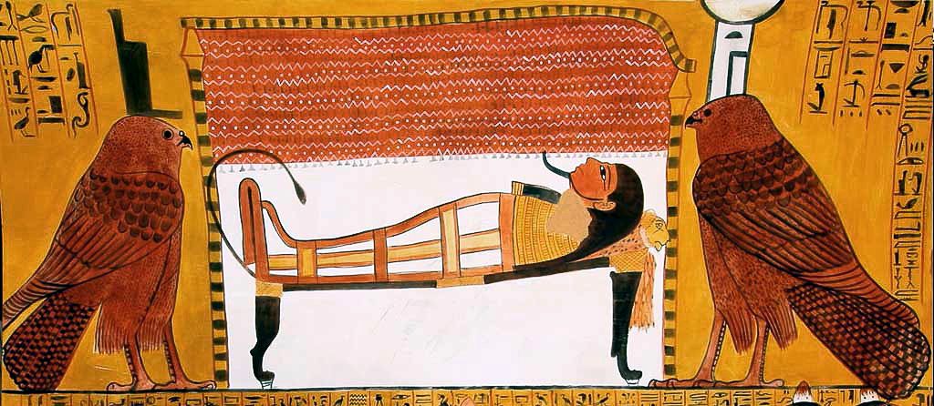 Isis (left) and Nephthys (right) as kites as they flank the mummy of Sennedjem, the owner of this tomb, 13th century BCE