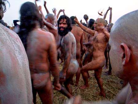 English: Nagababa running to their rituel bath at Sangam during Allahabad Ardh Kumbhmela 2007.