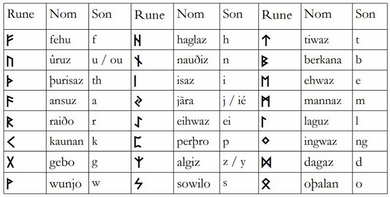 Tableau der Klangkorrespondenzen der 24 Runen aus dem alten Futhark.