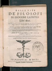 - Diogenes Laertius, The Lives, Opinions, and Remarkable Sayings of the Most Famous Ancient Philosophers, London: Edward Brewster, 1688