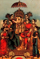Ganesha mit den Ashta Siddhi, die er im Ganesha Purana einsetzt, um den Dämonen Devantaka anzugreifen. Ganesha entfernt durch die Kraft des Wissens Hindernisse.