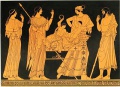 Herakles bringt den erymantischen Eber zu König Eurystheus (der sich in ein Pithos geflüchtet hat), Athena links und Mutter des Eurystheus rechts