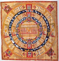 Der heilige Berg Meru ist im Zentrum der Welt ungeben vom Jambūdvīpa - Kontinent, in Form eines Kreises mit einem Durchmesser von 100,000 Yojanas und 6 hohen Bergen, die den Kontinent in 9 Zonen oder Ksetras teilen.