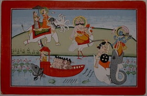 • Matsya sagt die Sintflut voraus, und Satyavrata Manu flieht mit den Seinen, vielen Lebewesen und mit Saatgut in ein Schiff.