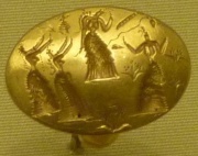 Allerdings zeigt ein kleines Siegel aus Knossos[1] eine von zwei Löwen flankierte weibliche Figur auf einem Berg. Sie trägt eine Krone mit Rosetten und hält einen Stab mit segnender Gebärde. Rechts steht ein Mann mit anbetend erhobenen Armen, und links ist ein mehrstöckiger Palast mit Doppelhörnern an der Fassade. Bei dieser Berggöttin fehlen allerdings die Nacktheit und die Mond-Aspekte usw..