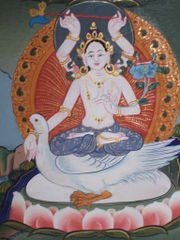 Ikonografisch wird sie auf einem weißen Lotus mit einem Mond und einer Gans dargestellt.