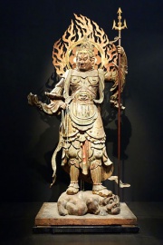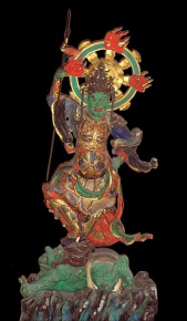 • Vaishravana : In seiner linken Hand hält er die schirmähnlich zusammengerollte Siegesfahne des Dharma. In der Rechten hält er entweder eine Pagode oder eine silberne juwelenspeiende Ratte. Er ist auch der König der schatzhütenden Yakshas.